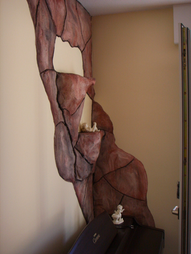 Durch die mit Putz und farblicher Gestaltung hergestellte Polygonalplattenoptik entstehen durch die herausgearbeiteten Vorsprünge Abstellmöglichkeiten für Dekoration. Dieses Beispiel kann von uns in jeder Farbe und Form auf jede Wand gebracht werden.